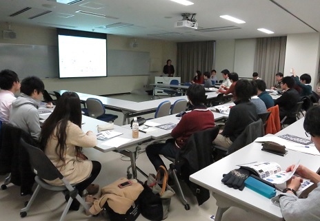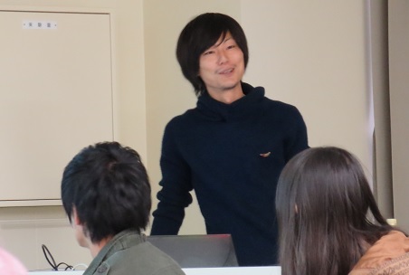 2013年11月8日(金)西浦研OBの石丸史大くん(西浦研5期生)が3年連続で西浦研を訪問し、会社紹介に加え社会の厳しさや社会人としての心構えなど、1時間にわたってご講演頂きました。当日は学年の垣根を越え、西浦研博士生からB3生まで30名を超える学生が積極的に参加して、大先輩の話を熱心に拝聴していました。講演後に行われた懇親会にも25名を超える学生が参加し、先輩との親睦を深めました。現役生は偉大なる大先輩の成長した姿をしっかりと目に焼きつけ、自身の将来像のイメージと重ね合わせて、足りないと感じる能力をしっかりと研究室にて培ってもらえれば思います。将来は石丸大先輩のように、社会で活躍できる人材へと成長することを切に願っています。