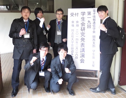 2014年2月28日(金)同志社大学京田辺キャンパスにて開催された電子情報通信学会関西支部学生会 第19回学生会研究発表講演会において、西浦研から5件の発表を行いました。多くの学生が初めての対外発表となりましたが、日ごろのゼミ発表での経験を存分に活用して最後まで自分の力でやり遂げました。今後より大きな学会での発表を目指して日々切磋琢磨することを切に願っております。