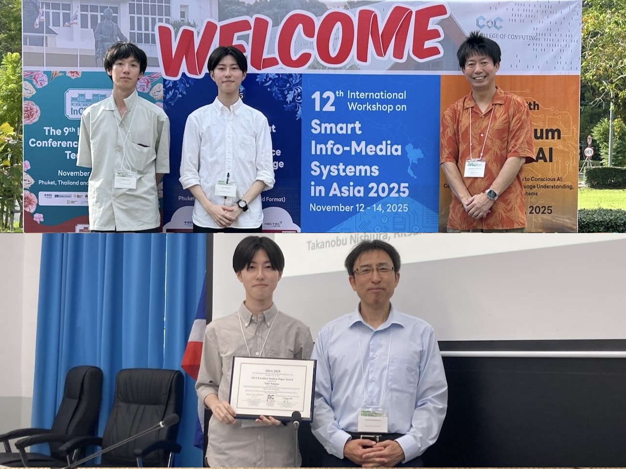2025年11月12〜14日 タイ王国プーケットに位置するPrince of Songkla University, Phuket Campusにて2025 International Workshop on Smart Info-Media Systems in Asia (SISA 2025)が開催され、西浦研からスタッフおよび学生合わせて3名が参加し、2件の研究成果発表を行いました。当日はオーラル発表の後に続けてポスター発表を行う長丁場のスタイルでしたが、参加者らにしっかりと英語で研究成果を伝えることができました。その結果、中野さん(M2)に、SISA Excellent Student Paper Award が授与され、大きな励みとなりました。今後もより権威の高い国際会議での発表を目指して日々精進してもらえればと期待しております。