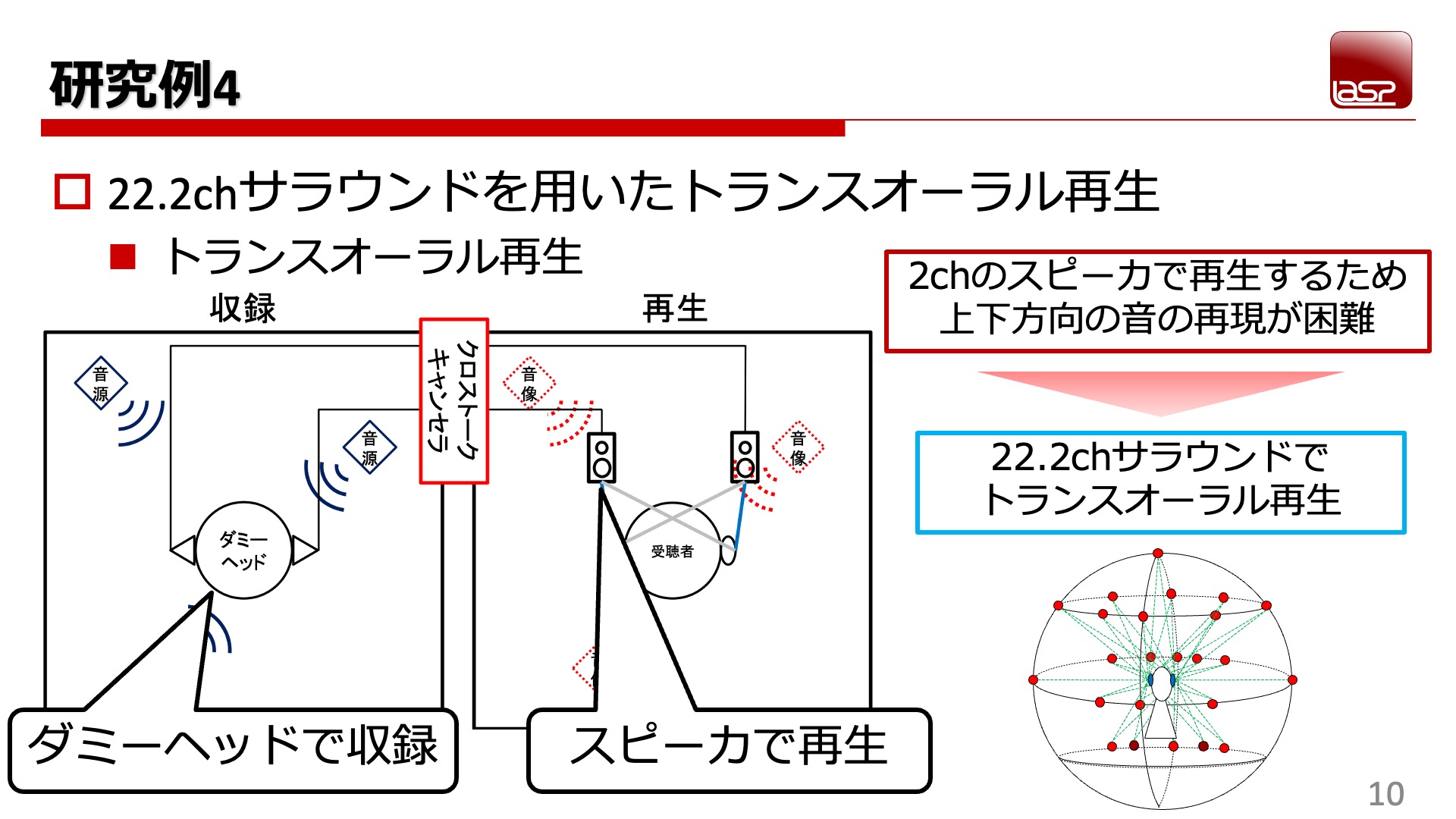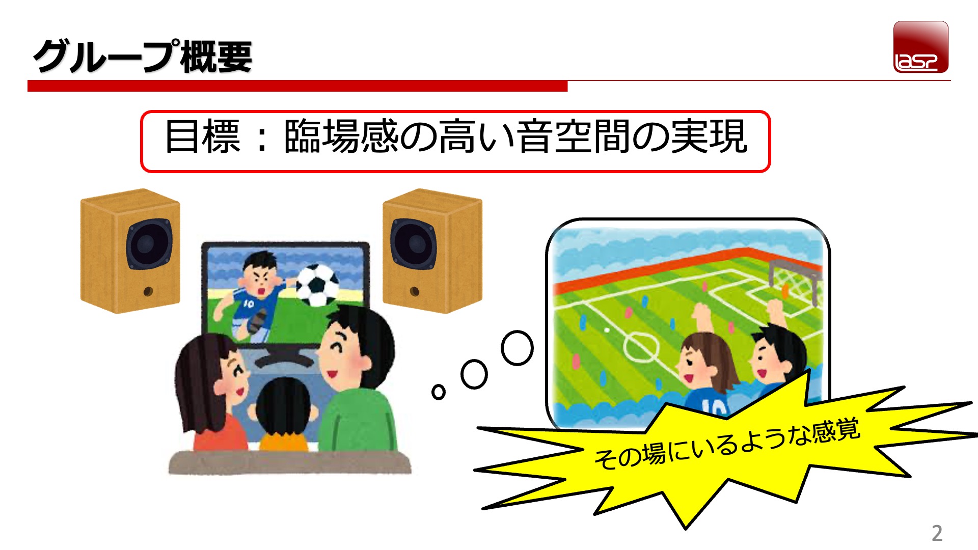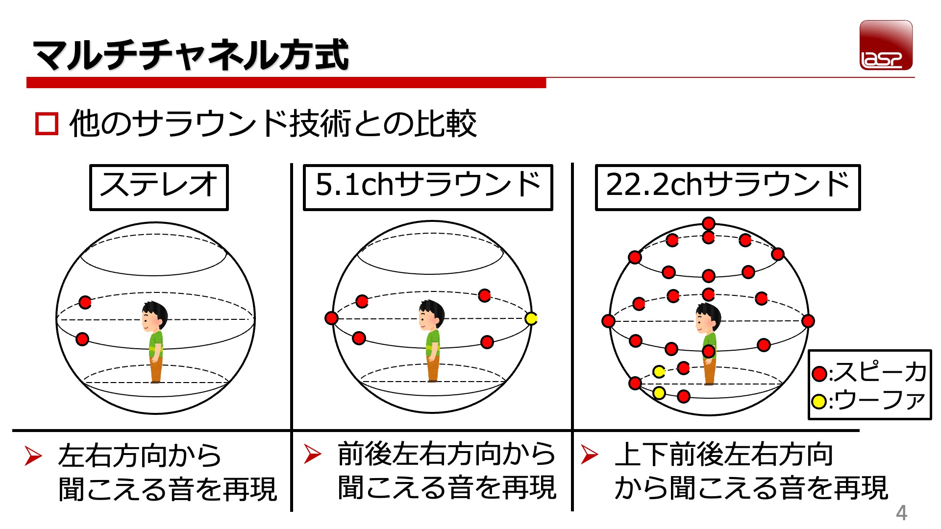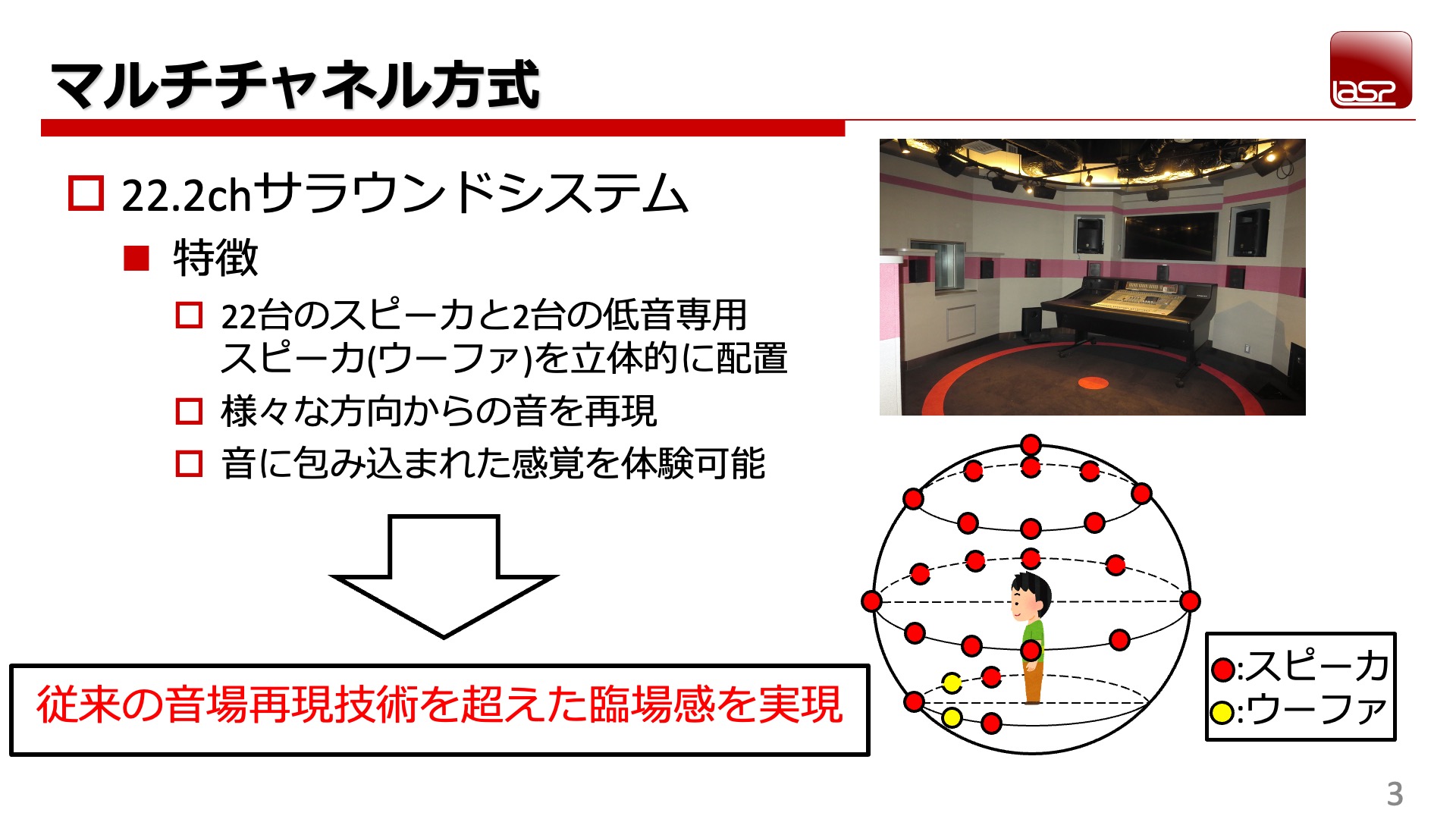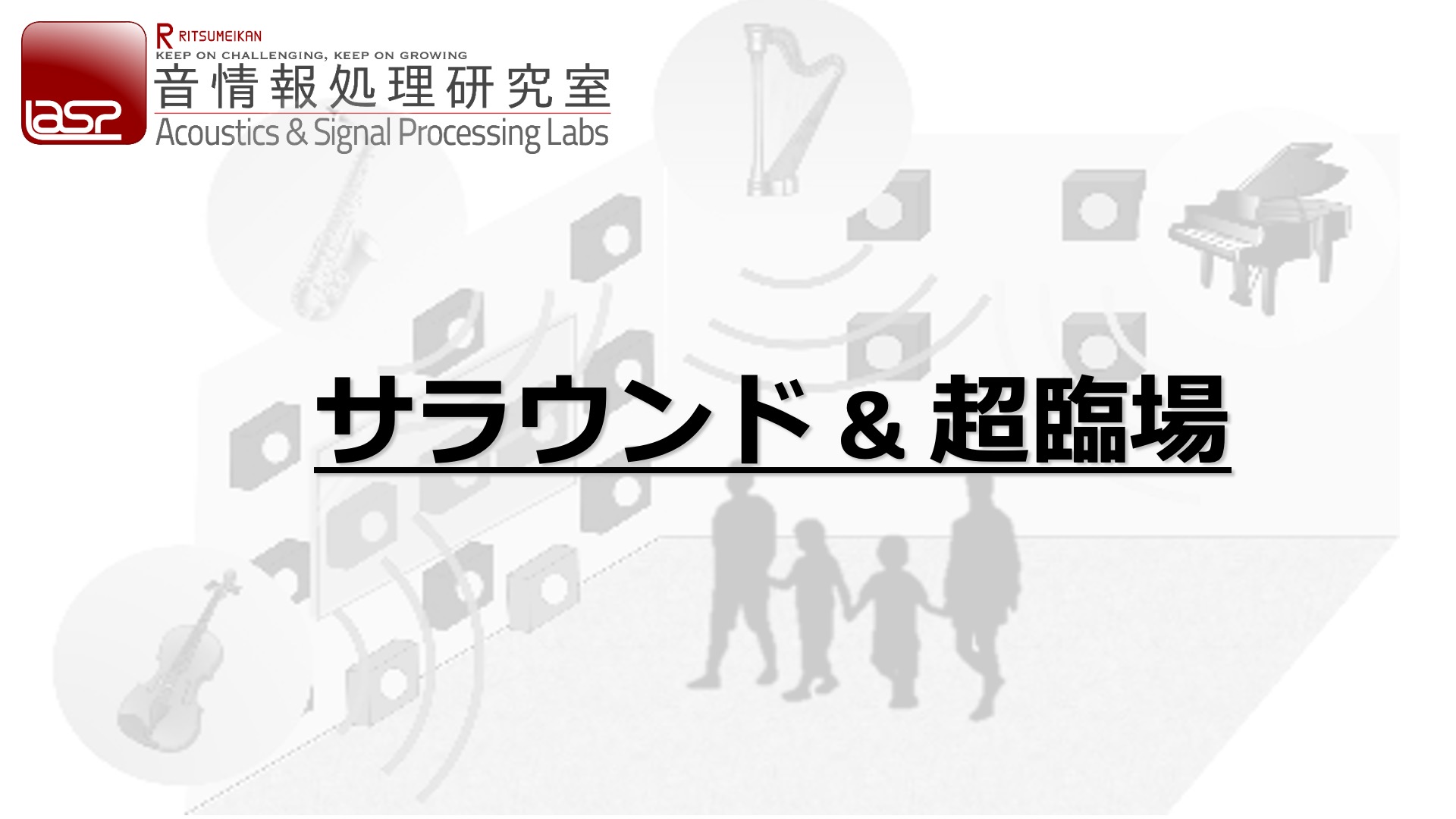 サラウンド & 超臨場では,臨場感の高い音空間を再現することを目標として研究を行っています. 特に22.2chサラウンドは,22本のスピーカと2本の重低音専用スピーカを活用し, 音に包まれたような高臨場空間を構築することができます. 本研究室では,本物の音環境を超える臨場感を目指して, 特に音質と音像の超解像化を実現し, 最高品質の音空間を目指して研究を推進しています.