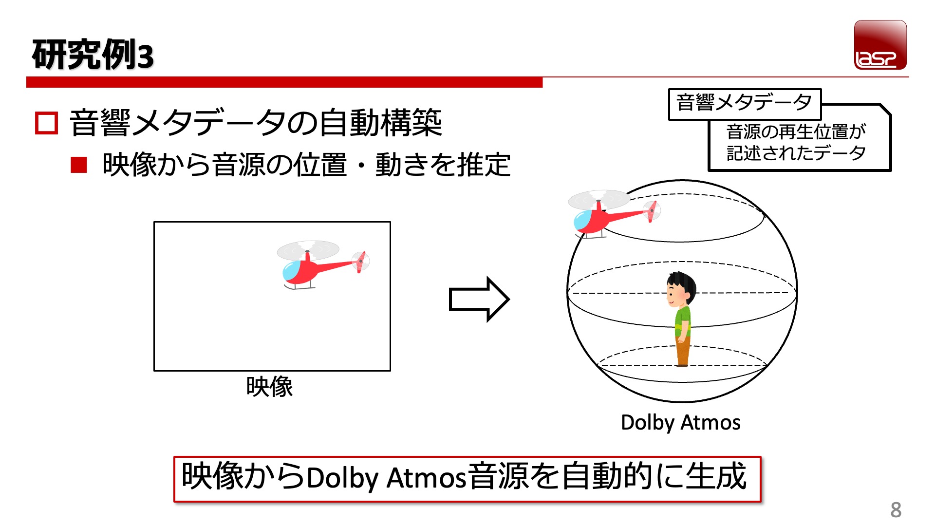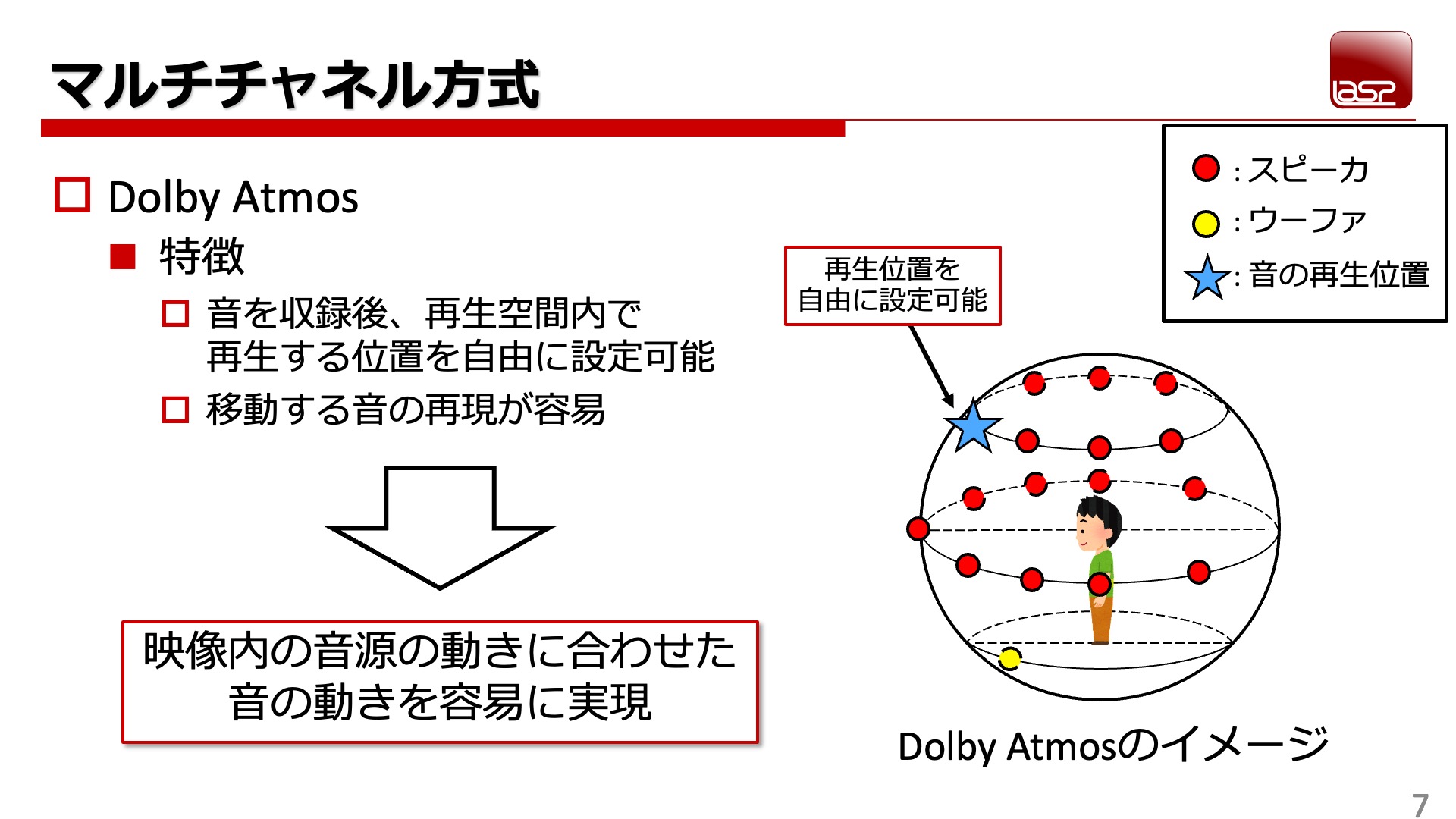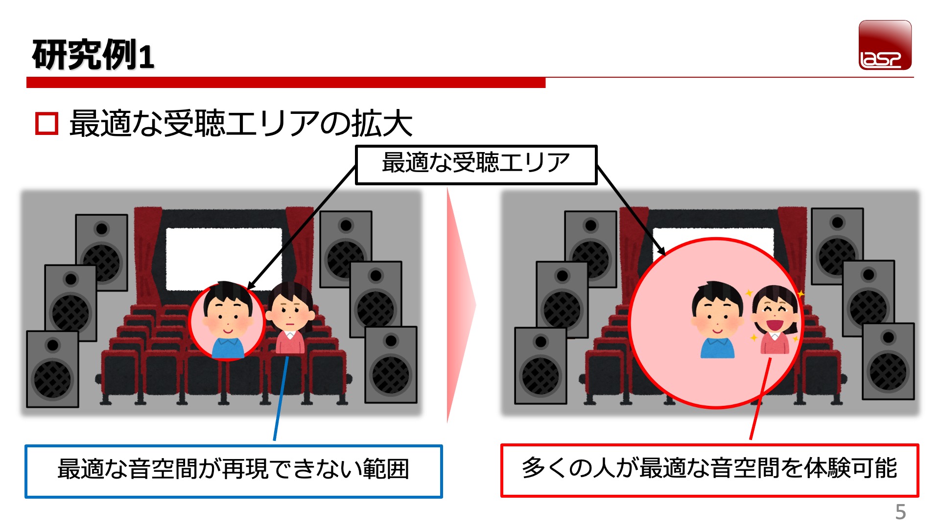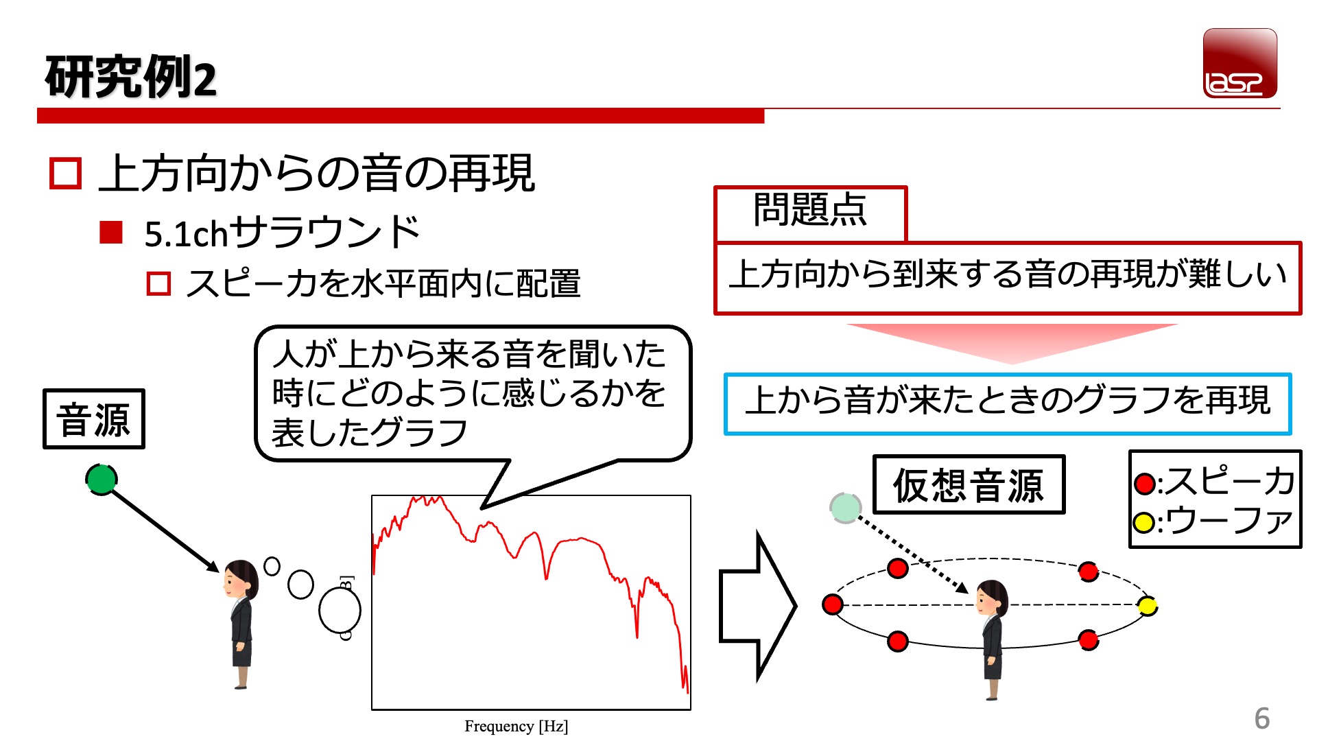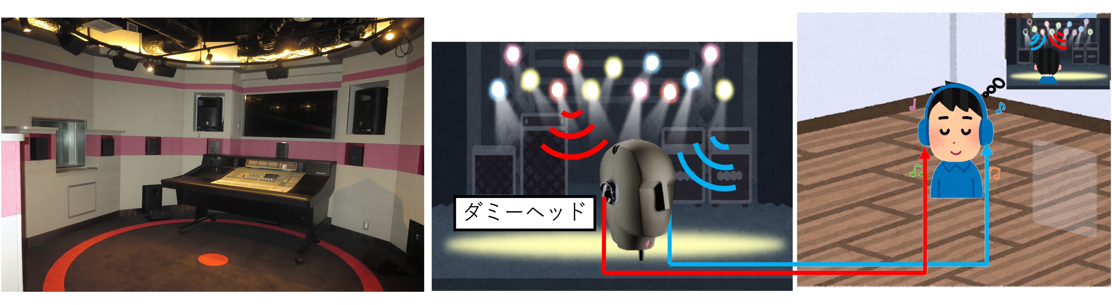 サラウンド & 超臨場では,臨場感の高い音空間を再現することを目標として研究を行っています. 特に22.2chサラウンドは,22本のスピーカと2本の重低音専用スピーカを活用し, 音に包まれたような高臨場空間を構築することができます. 本研究室では,本物の音環境を超える臨場感を目指して, 特に音質と音像の超解像化を実現し, 最高品質の音空間を目指して研究を推進しています.