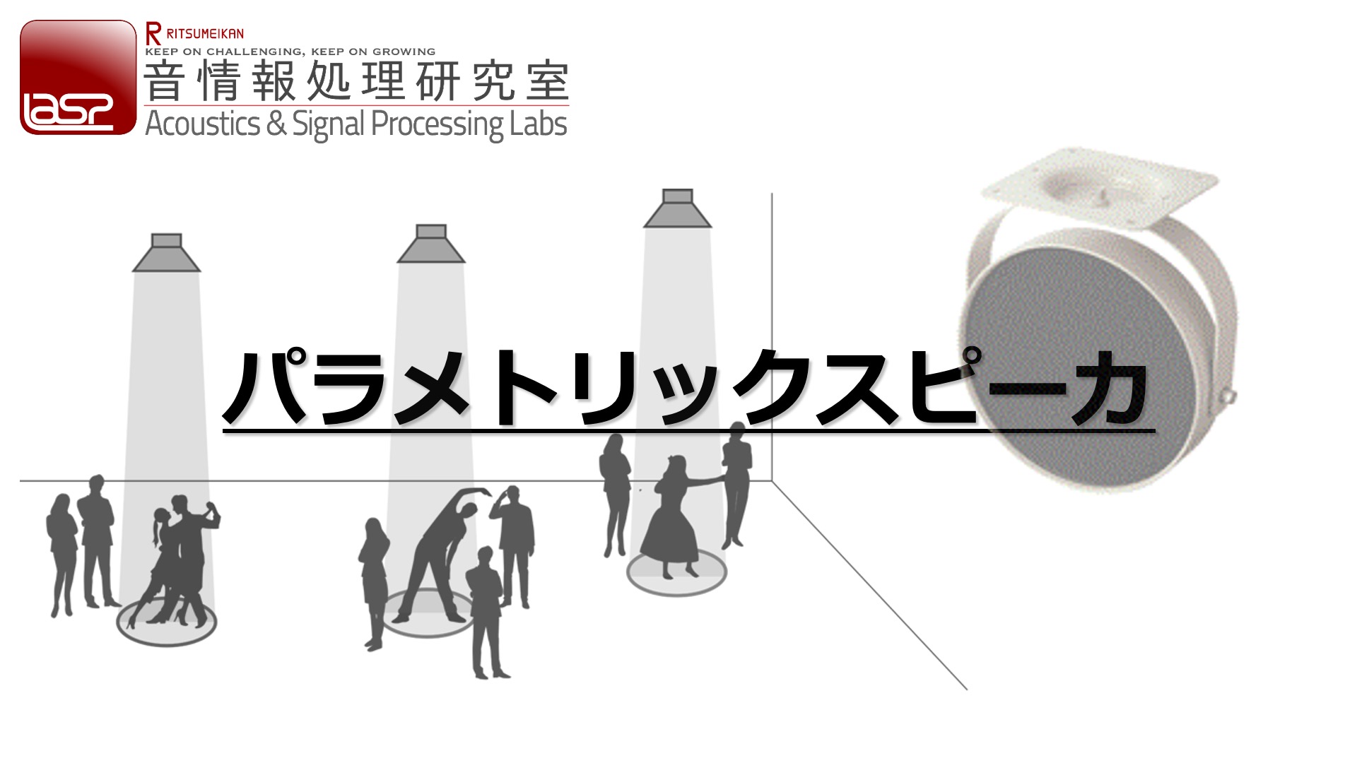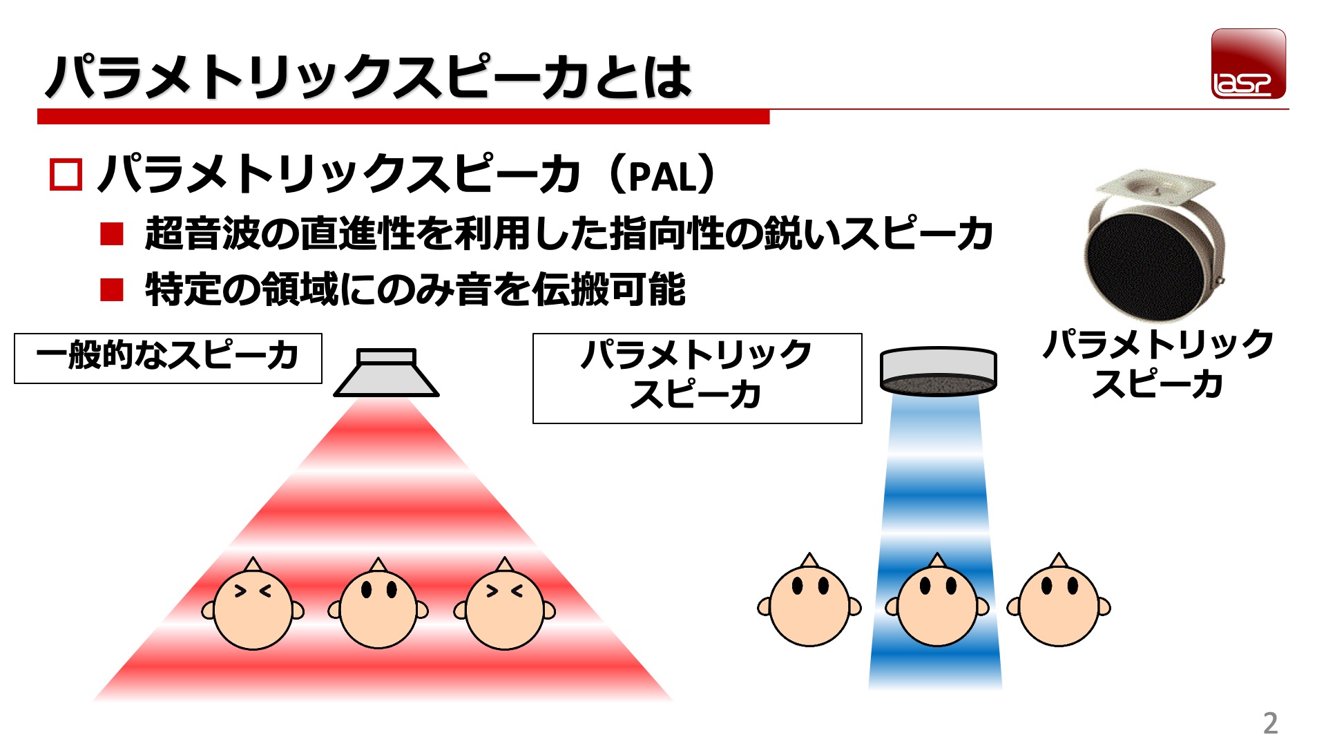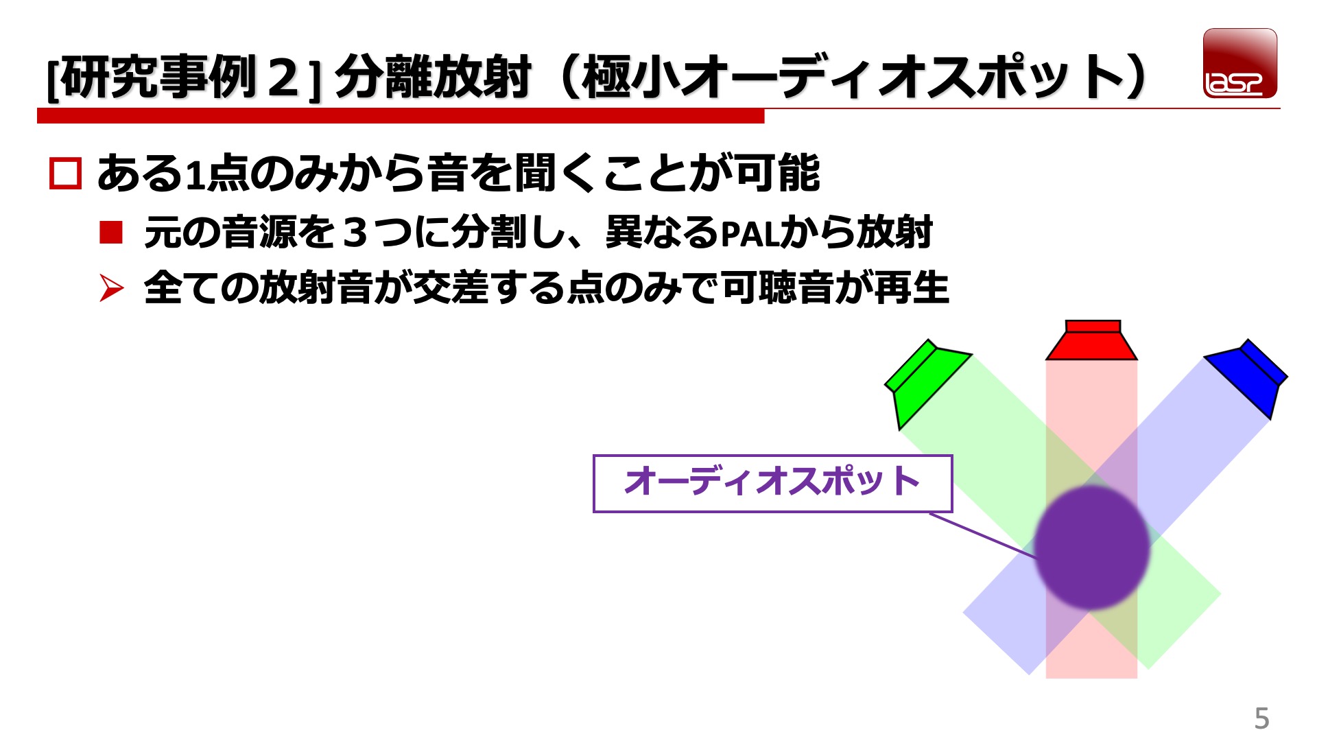 パラメトリックスピーカは超音波の直進性を利用することで音を直線上に届けることができます. このパラメトリックスピーカを使用すると,空間を音で分割することができるので, 美術館の音声案内のように複数の人々にそれぞれ独立した音を届ける際に有効利用できます. また,空間のある一点のみから音が聞こえる極小領域オーディオスポットなど, パラメトリックスピーカを用いた応用研究も幅広く行われています.