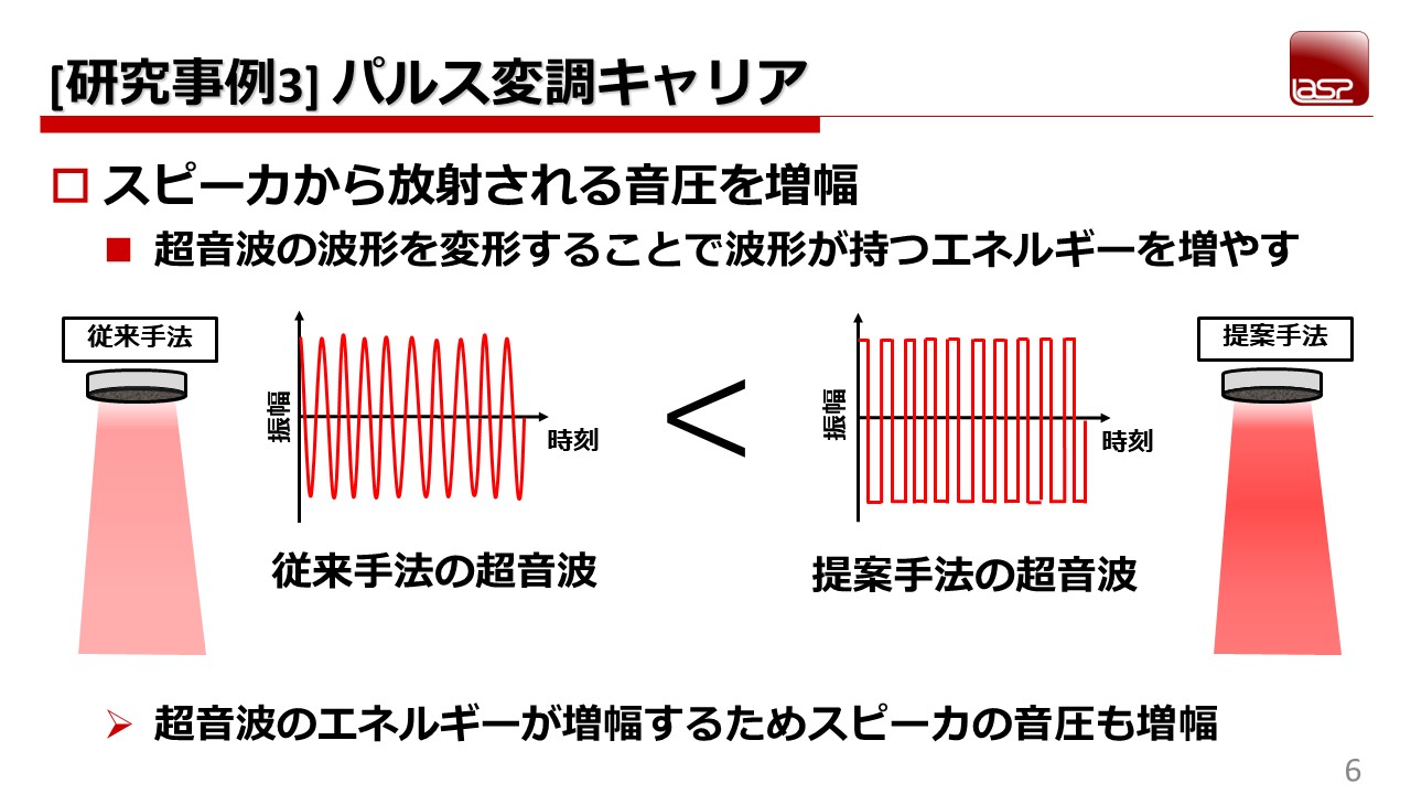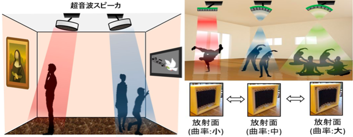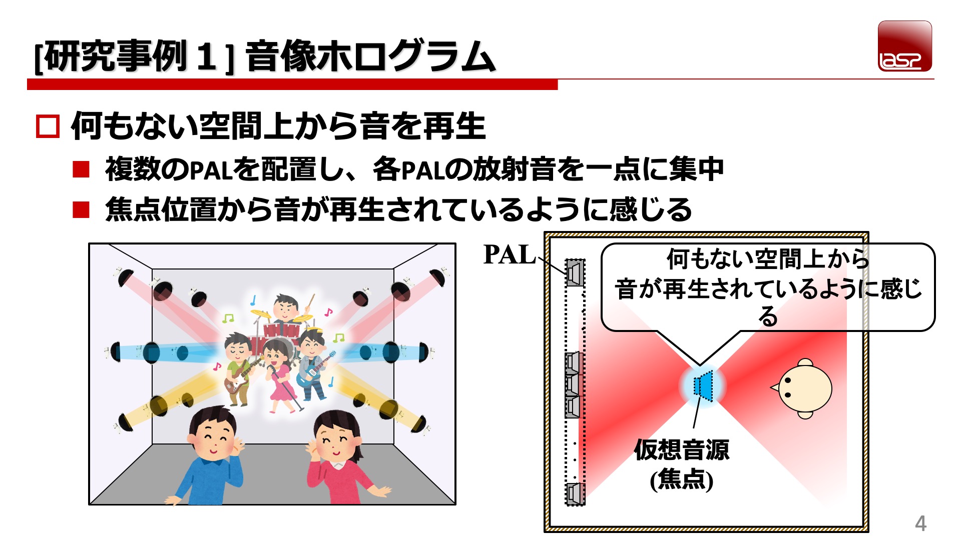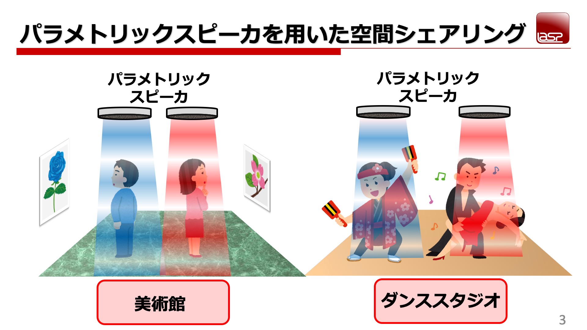 パラメトリックスピーカは超音波の直進性を利用することで音を直線上に届けることができます. このパラメトリックスピーカを使用すると,空間を音で分割することができるので, 美術館の音声案内のように複数の人々にそれぞれ独立した音を届ける際に有効利用できます. また,空間のある一点のみから音が聞こえる極小領域オーディオスポットなど, パラメトリックスピーカを用いた応用研究も幅広く行われています.
