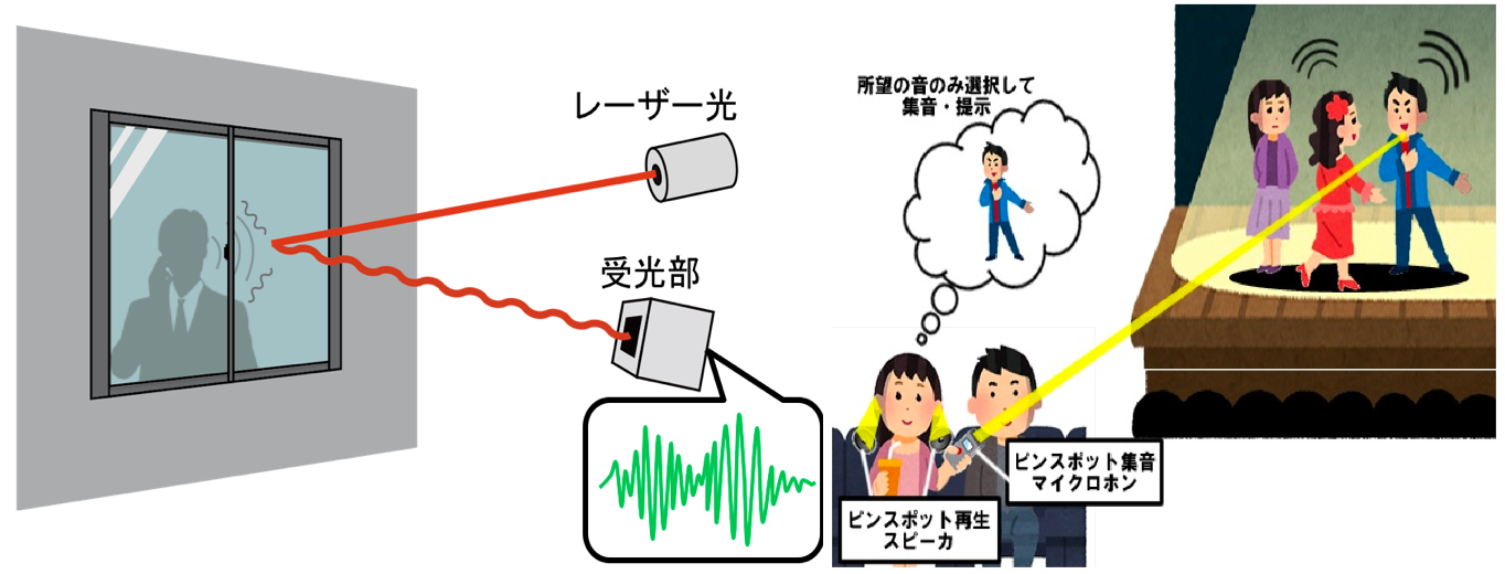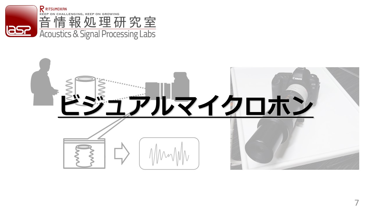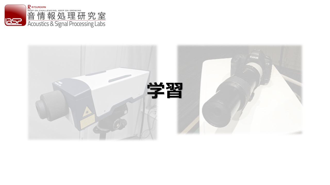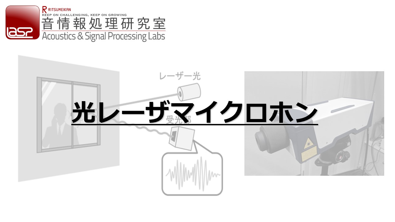 学習では,光レーザマイクロホンやビジュアルマイクロホンといった新しい音収録手法の検討に加え,深層学習に基づく音質改善や音源分離・音環境理解について研究を行なっています. 特に,光レーザマイクロホンは,レーザ光を用いて音を収録することができるマイクロホンです. 音によって発生した振動は,空気中を伝わり,付近の物体を振動させます. その振動する物体に対してレーザ光を照射し,照射物体で反射した光から振動を計測することで,音を収録します. 反射光が得られる限り音を収録することができるので, ガラスの向こう側の会話を収録することや,遠くの音を収録することができるという特徴があります.