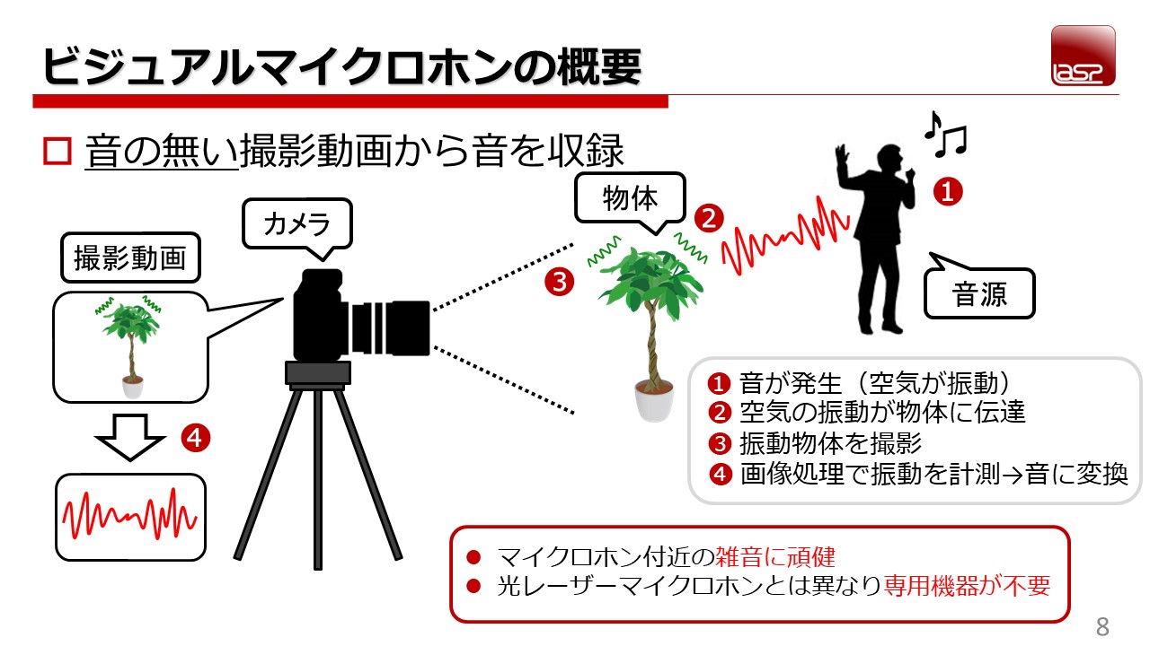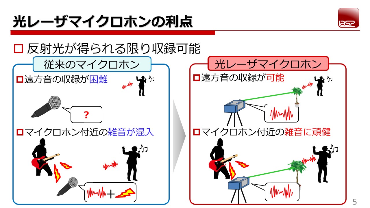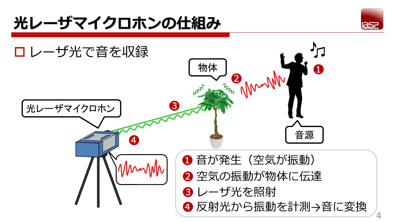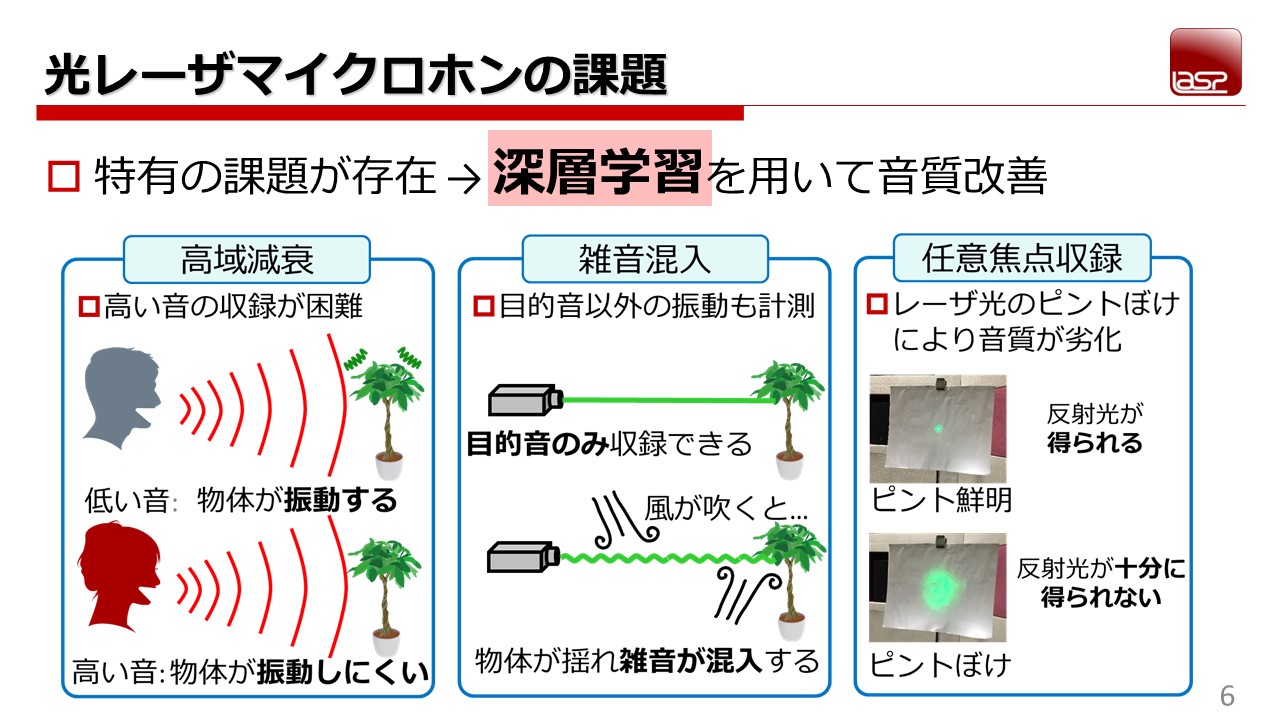学習では,光レーザマイクロホンやビジュアルマイクロホンといった新しい音収録手法の検討に加え,深層学習に基づく音質改善や音源分離・音環境理解について研究を行なっています. 特に,光レーザマイクロホンは,レーザ光を用いて音を収録することができるマイクロホンです. 音によって発生した振動は,空気中を伝わり,付近の物体を振動させます. その振動する物体に対してレーザ光を照射し,照射物体で反射した光から振動を計測することで,音を収録します. 反射光が得られる限り音を収録することができるので, ガラスの向こう側の会話を収録することや,遠くの音を収録することができるという特徴があります.