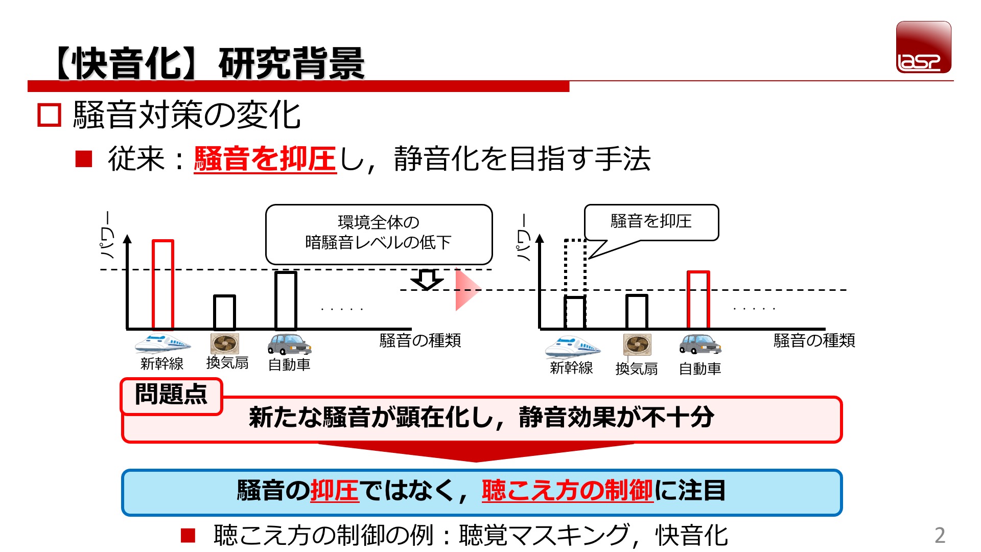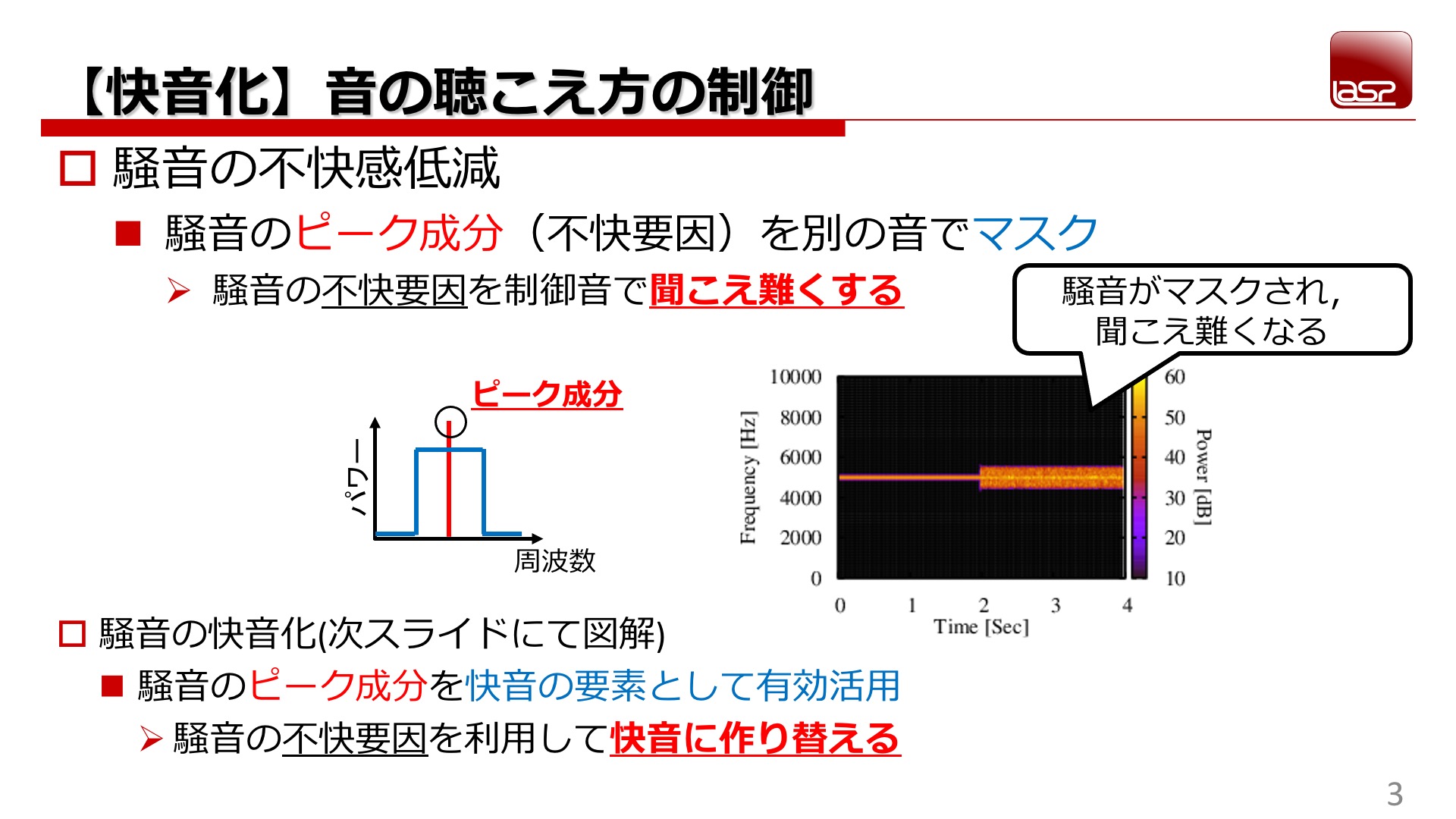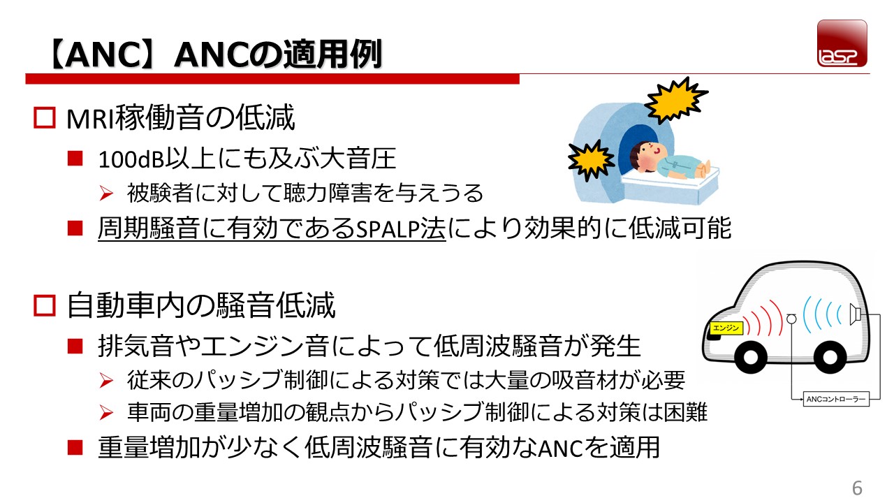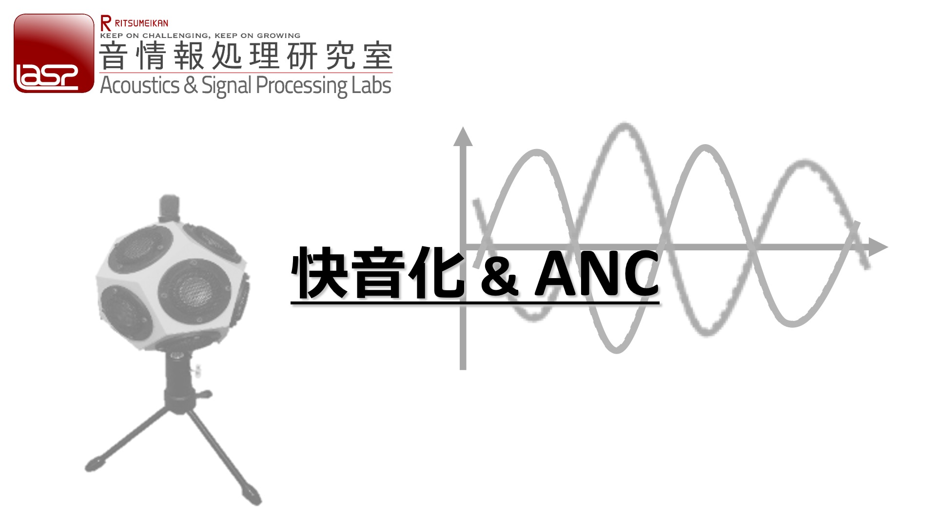 快音化 & ANCでは,従来の騒音低減技術であるANC (アクティブノイズコントロール) に加え,聴覚マスキングを応用した騒音の不快感低減や, 制御音付与によって聴こえ方を制御する快音化技術について研究しています.ANCは音で騒音を打ち消す技術であり,MRI稼働音やいびき騒音等への適用を目指しています. また,快音化技術は騒音自体を低減するのではなく聴覚的に気にならないようにする技術であり,ANCによる低減が困難な衝突音等への適用を目指しています.