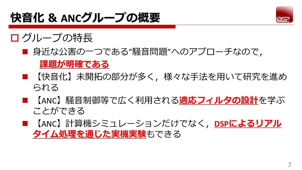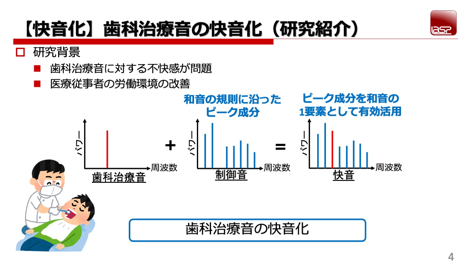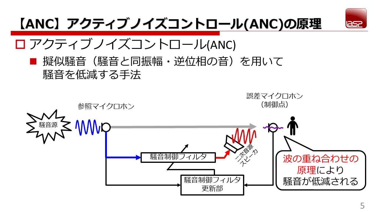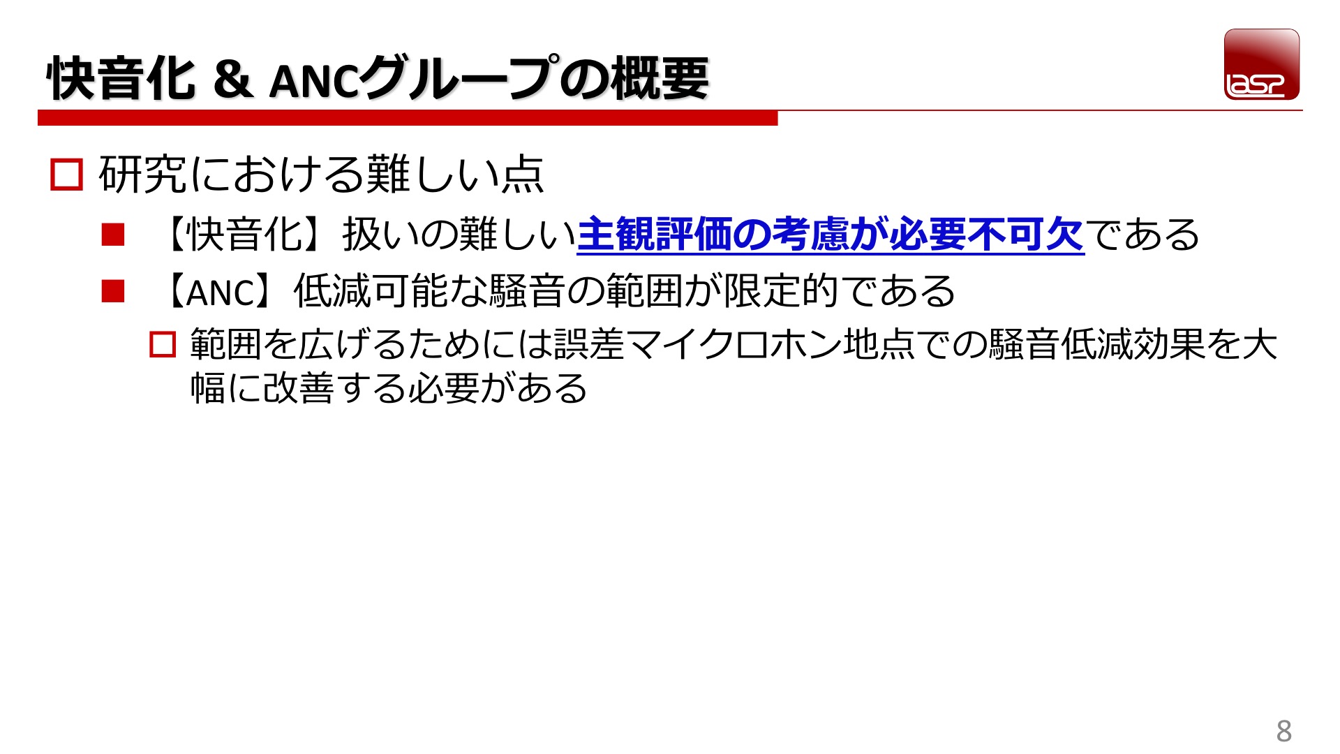 快音化 & ANCでは,従来の騒音低減技術であるANC (アクティブノイズコントロール) に加え,聴覚マスキングを応用した騒音の不快感低減や, 制御音付与によって聴こえ方を制御する快音化技術について研究しています.ANCは音で騒音を打ち消す技術であり,MRI稼働音やいびき騒音等への適用を目指しています. また,快音化技術は騒音自体を低減するのではなく聴覚的に気にならないようにする技術であり,ANCによる低減が困難な衝突音等への適用を目指しています.